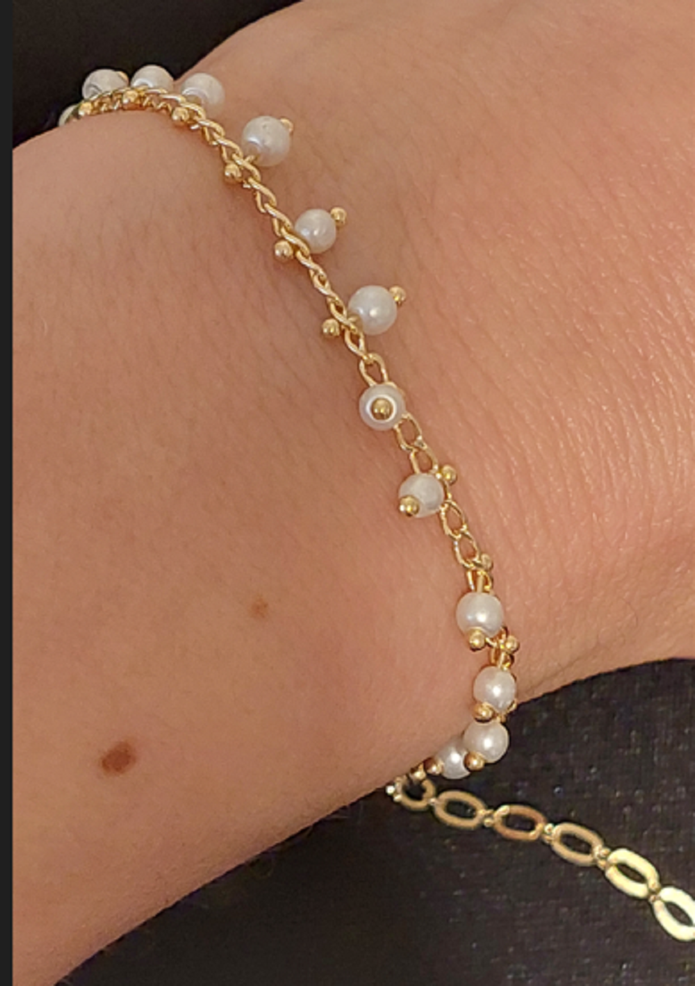 Pulseira delicada, com pequenos pingentes de pérolas artificiais. Pode ser regulada.