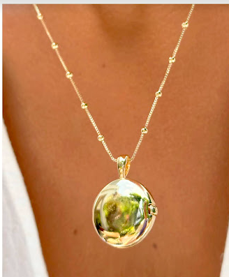 Relicário redondo, clássico. Corrente com detalhes de bolinhas. Permite regulagem.