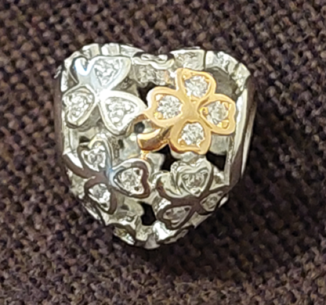 Charm inspiração grandes marcas, em prata 925, em formato de coração, com detalhes de trevo cravejados com zircônias e banho de metal rosê. Serve perfeitamente em pulseiras Pandora e Life.
