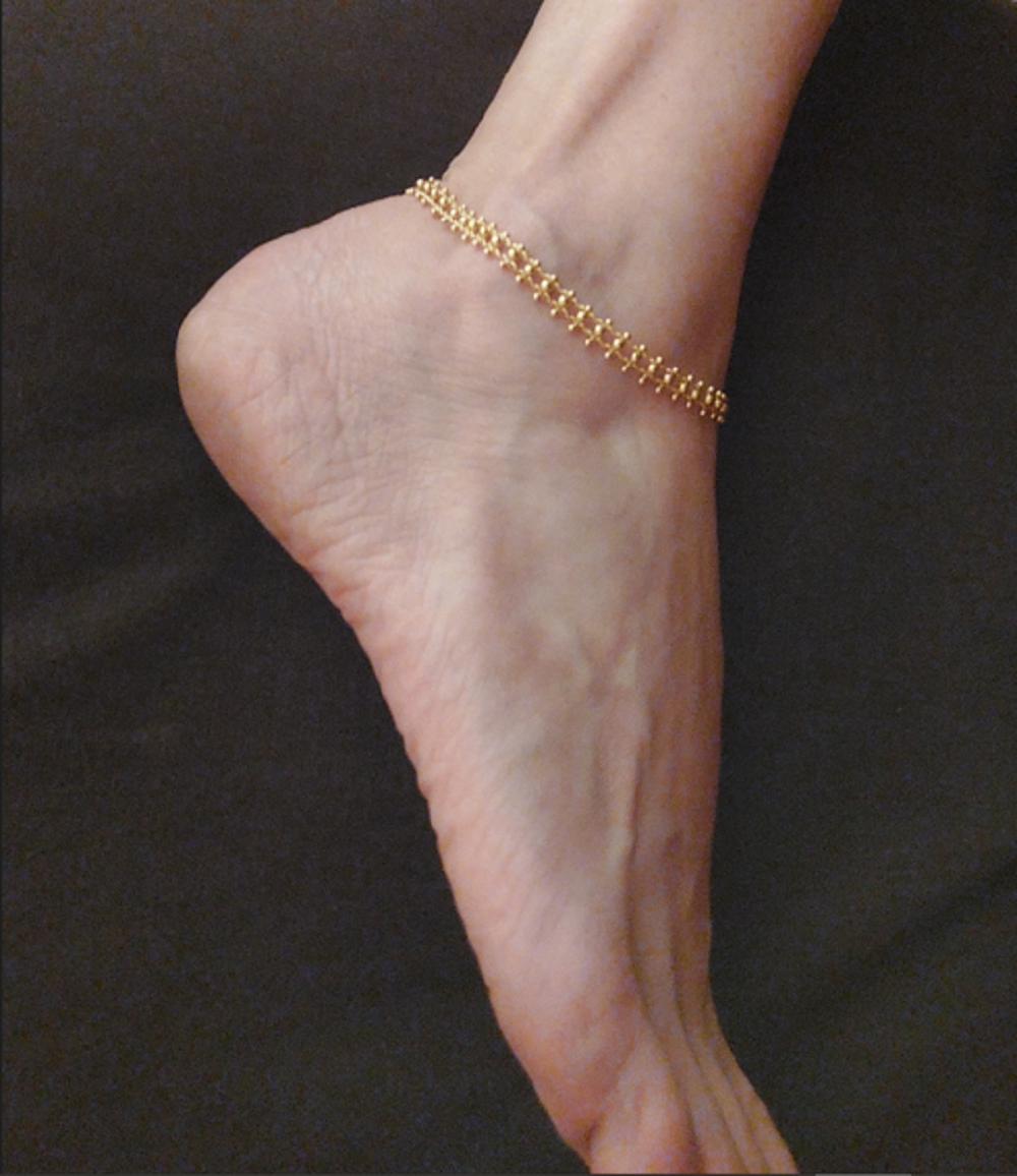 Tornozeleira malável, com detalhes delicados que remetem a renda.